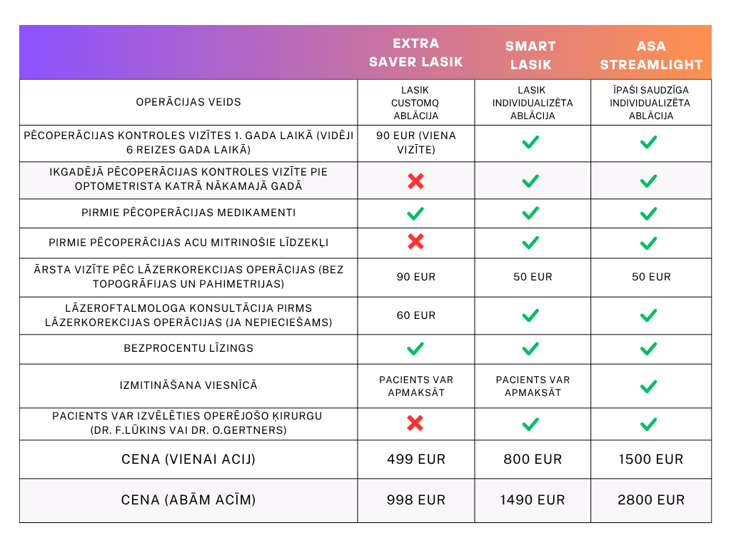 Lai arī redzes problēmas visbiežāk ir viegli ārstējamas ar lāzeroperācijas palīdzību, katrs pacients ir ļoti individuāls gadījums, jo katram no mums ir unikālas acis, fizioloģiskās īpašības, vecums un, protams, redzes kvalitāte. Klīnikā izmantojam starptautiski atzītāko un populārāko metodi – LASIK, un dažādu pacientu komfortam esam īpaši specializējušies divās atšķirīgās metodēs – SMART LASIK un ASA (Advanced Surface Ablation) Streamlight, bet pacientu labklājībai izveidojuši trīs piedāvājumus – EXTRA SAVER LASIK, SMART LASIK un ASA Streamlight.